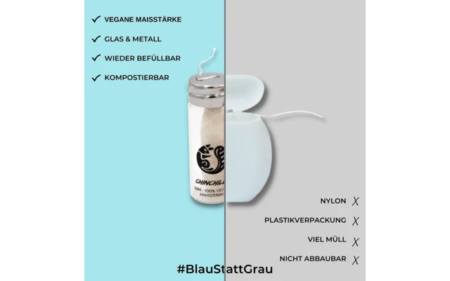 - Vegan und plastikfrei: Die Zahnseide aus Maisstärke und Candelillawachs ist 100% vegan und kommt im stylischen Glasflakon als 30 m Variante. Die Zahnseide kann ganz einfach nachgefüllt werden.