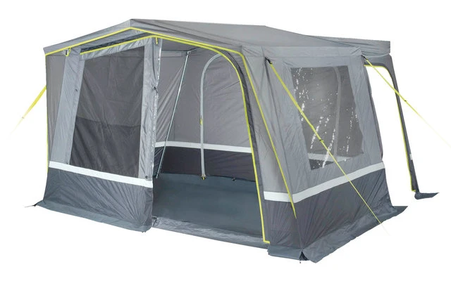 Das Steilwandzelt mit Stahlrohrgestänge hat eine sehr hohe Stabilität und optimalen Raumnutzen. Herausnehmbarer Wannenboden und PVC Faulstreifen halten Schmutz und Nässe aus dem Zelt. Der Wannenboden wird einfach am Außenzelt eingehängt und kann zum leichten Reinigen herausgenommen werden. Die Verandafront lässt sich je nach Wetterlage bis zur Mitte oder ganz öffnen.