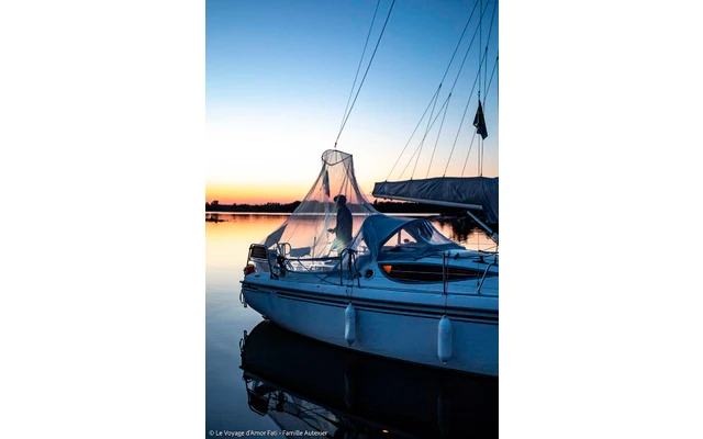 Moskitonetz, Packsack mit Zugband, Montagematerial (Schnur, Haken, Dübel)